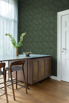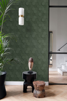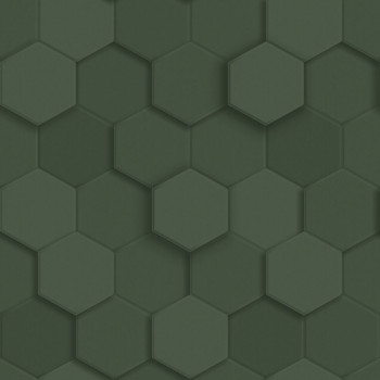 Vliesová tapeta na zeď, s 3D motivem včelí plástve / hexagonů v tmavě zelených odstínech.