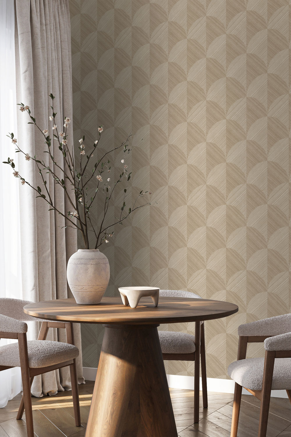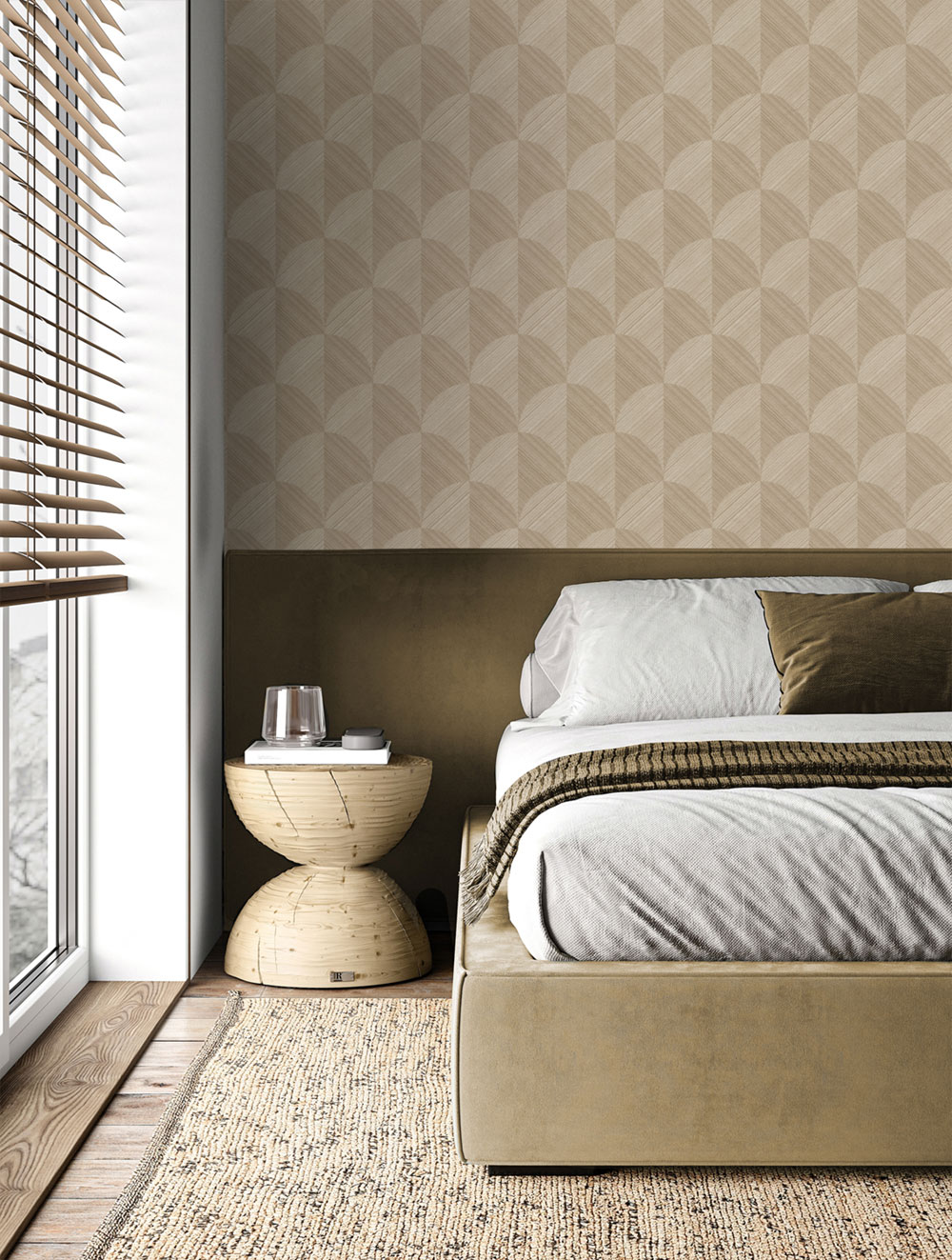 Barevná paleta se drží trendu návratu k přirozenosti: tlumená béžová, šalvějová, pudrová terracotta, hnědá i černá, doplněné elegantními tóny zlata. V kolekci najdete také motivy připomínající panely, které dodají interiéru moderní a strukturovaný výraz.