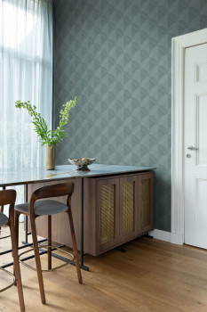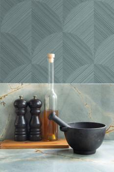 Vliesová tapeta na zeď, grafický 3D motiv v odstínech šedo-modré.