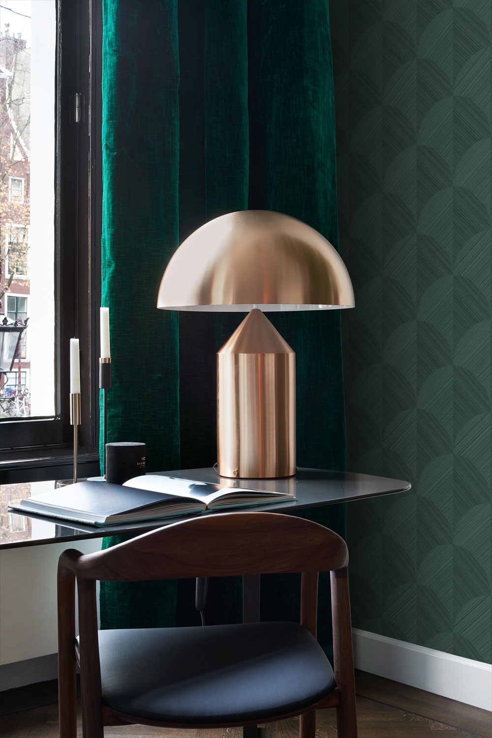 Vliesová tapeta na zeď, grafický 3D motiv v odstínech tmavě zelené.