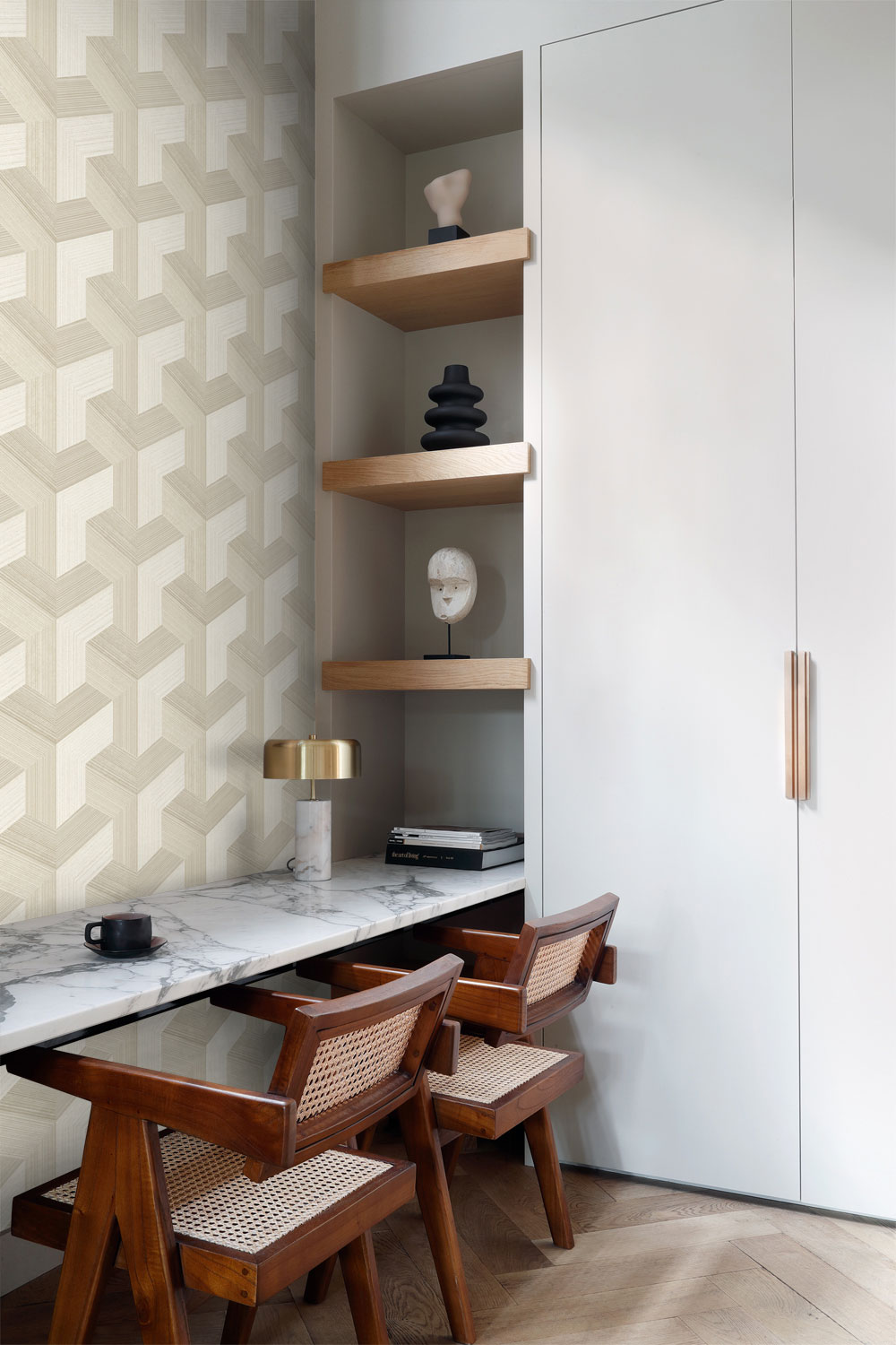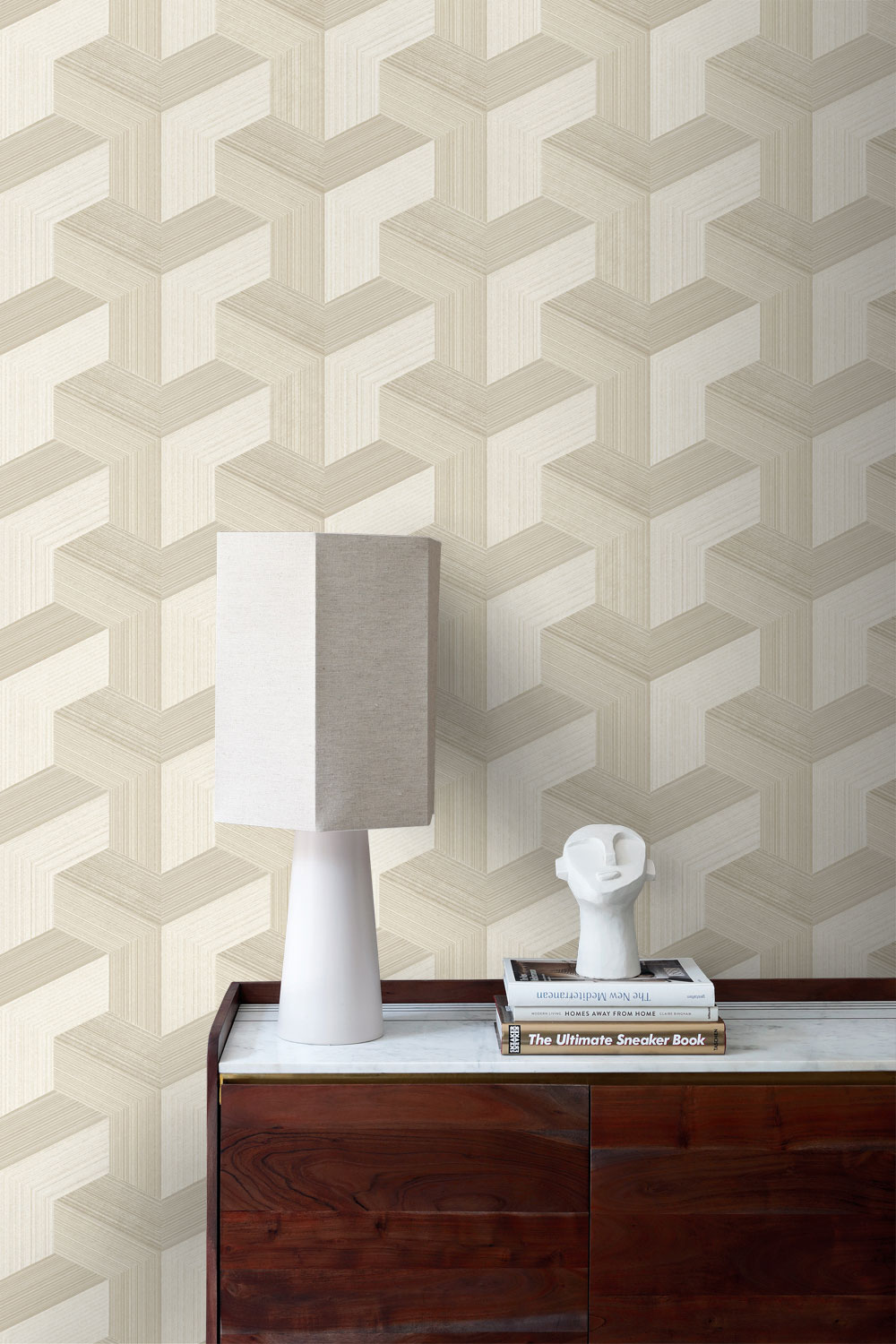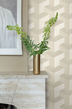 Vliesová tapeta na zeď, grafický 3D motiv v odstínech krémové a světle béžové.