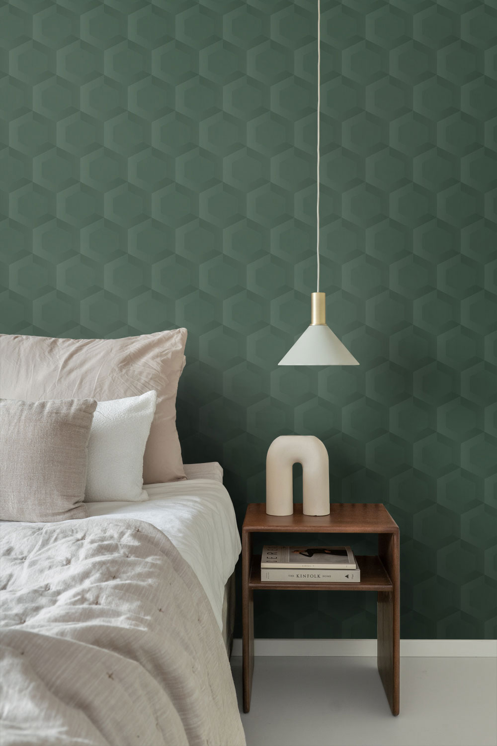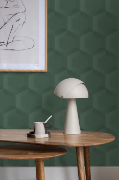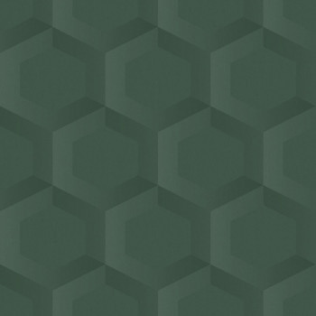 Vliesová tapeta na zeď, s 3D motivem včelí plástve / hexagonů, odstíny tmavě zelené.
