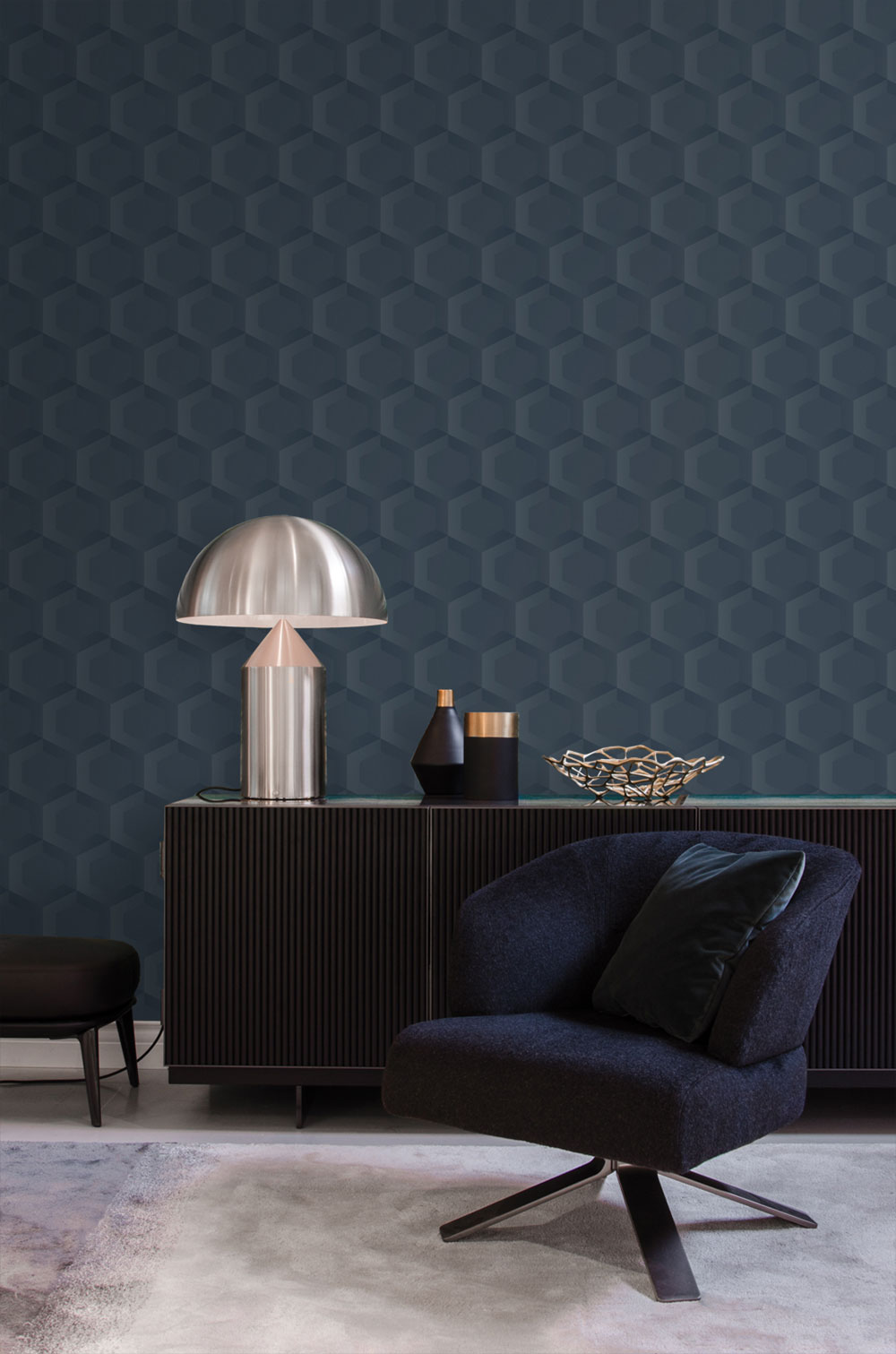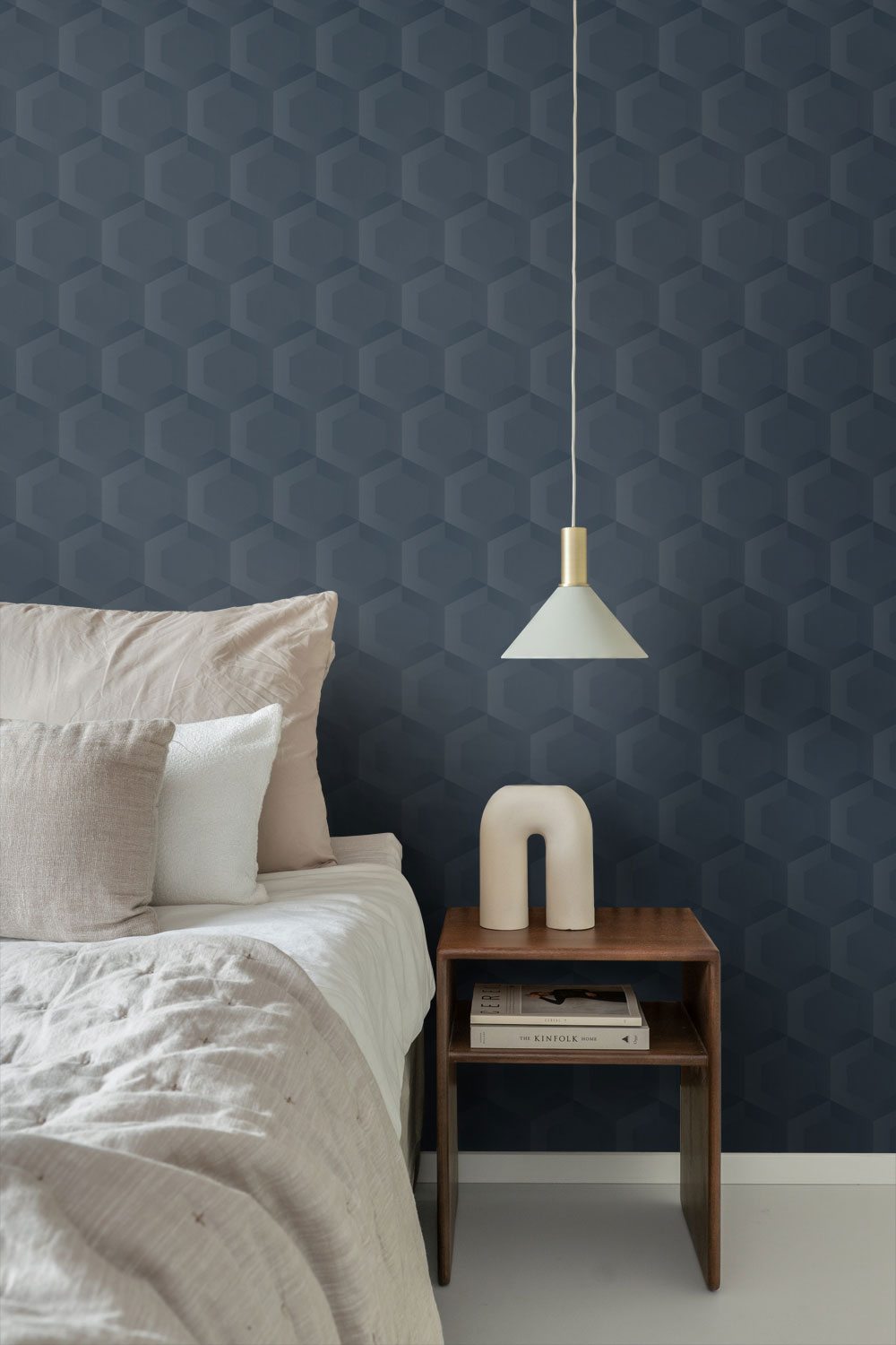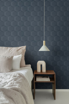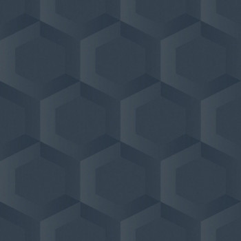 Vliesová tapeta na zeď, s 3D motivem včelí plástve / hexagonů, odstíny tmavě modré.