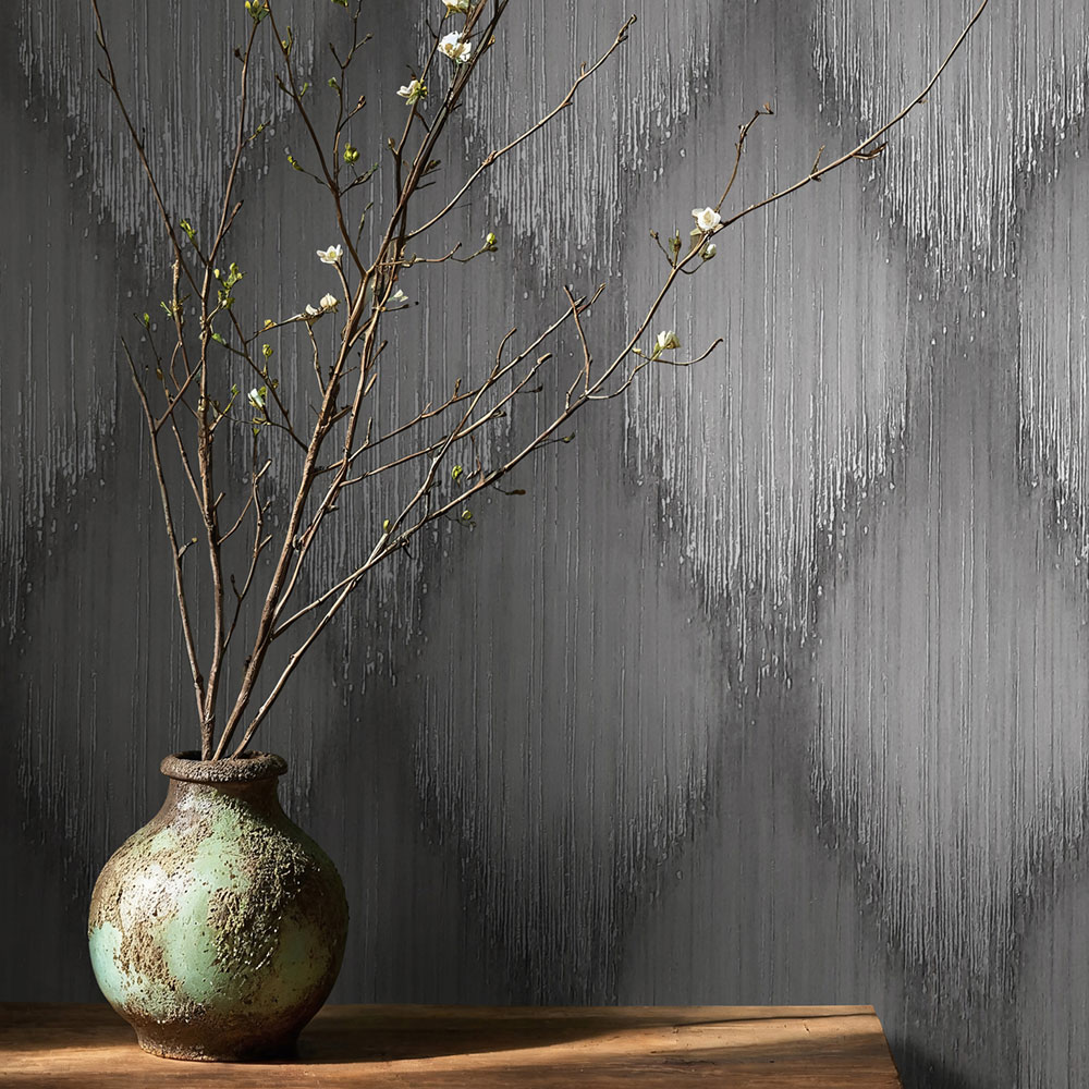 Vliesová tapeta s vinylovým povrchem, proužková textura v odstínech šedo-černé, metalické stříbrné odlesky vytváří grafický vzor.