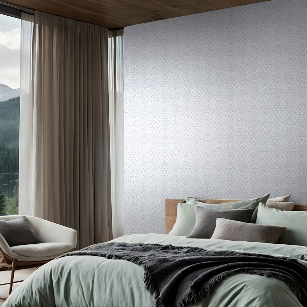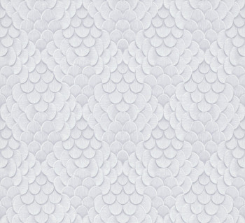 Vliesová tapeta s vinylovým povrchem, efektní 3D vzor, hra barev a stínů v odstínech šedo-bílé evokuje plastické šupiny, jemná textura.
