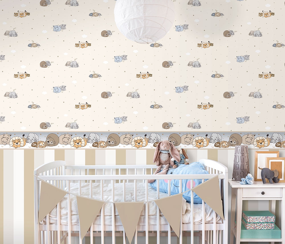 Změňte strohé stěny a vytvořte útulný pokojíček, ve kterém se vaše děti budou cítit dobře. Zvířátka na krémové papírové tapetě. K lepení doporučujeme lepidlo Beeline. Kombinujte se souvisejícími tapetami a bordurami z kolekce.