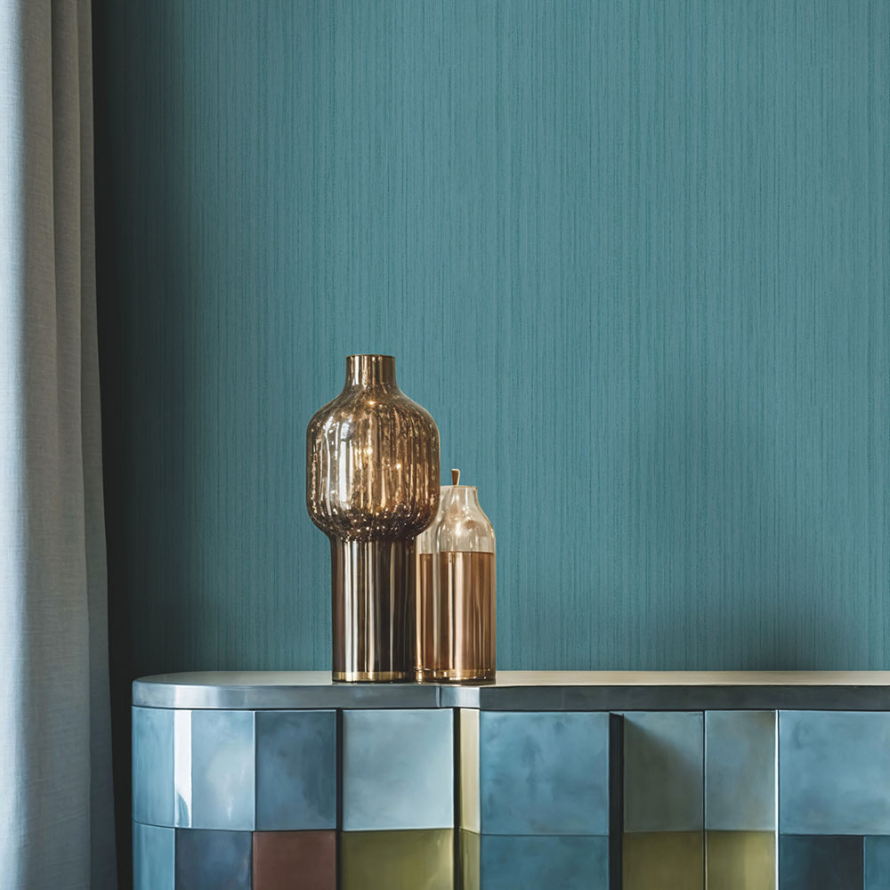 Vliesová tapeta s vinylovým povrchem, odstíny tyrkysové, jemně plastická látková textura.
