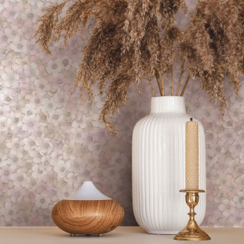 Vliesová tapeta s vinylovým povrchem, květinový vzor, odstíny růžové a béžové, jemně plastická látková textura.