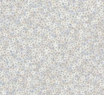 Vliesová tapeta s vinylovým povrchem, květinový vzor, odstíny šedo-modré a béžové, jemně plastická látková textura.