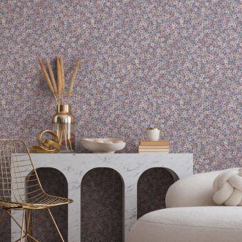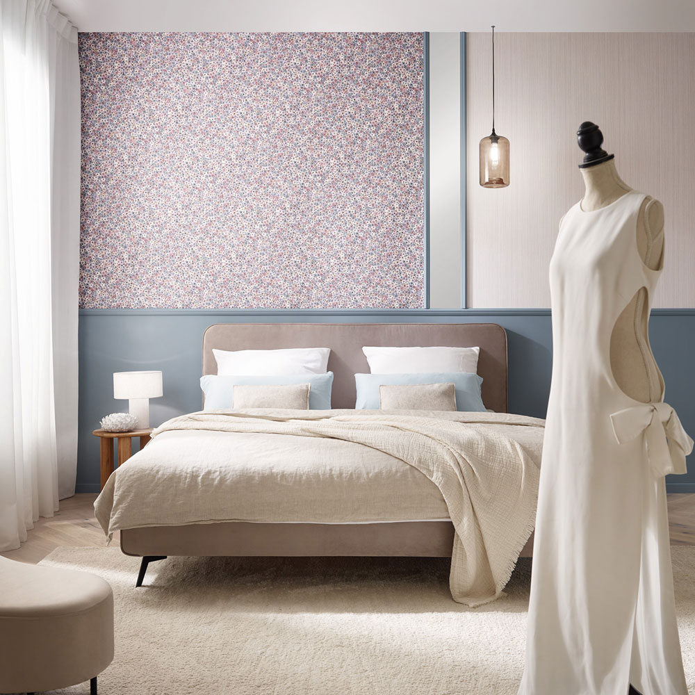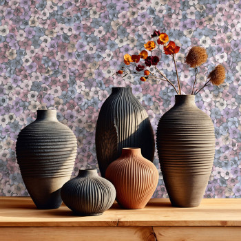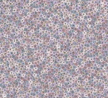 Vliesová tapeta s vinylovým povrchem, květinový vzor, odstíny modré, fialové a růžové, jemně plastická látková textura.