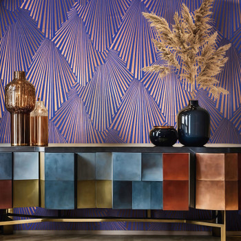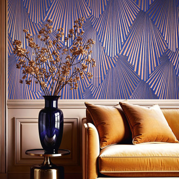 Vliesová tapeta s vinylovým povrchem, odstíny matné královské modré a kovově pololesklé měděné, jemně plastický grafický vzor s 3D efektem.