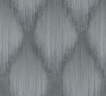 Vliesová tapeta s vinylovým povrchem, proužková textura v odstínech šedo-černé, metalické stříbrné odlesky vytváří grafický vzor se štrasovými krystaly.