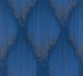 Vliesová tapeta s vinylovým povrchem, proužková textura v odstínech modré, metalické zlaté odlesky vytváří grafický vzor se štrasovými krystaly.