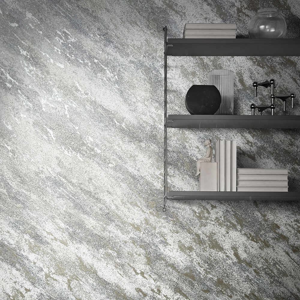 Vliesová tapeta s vinylovým povrchem, šedo-stříbrná, drobné zlaté akcenty, vzhled a textura štukové omítky.