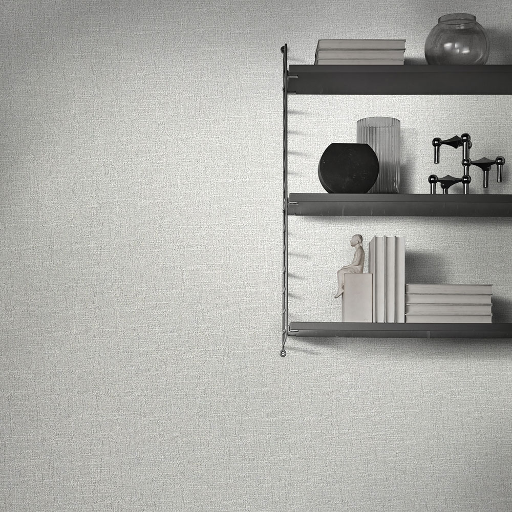 Vliesová tapeta s vinylovým povrchem, látková textura, šedá melanž se stříbrnými akcenty.