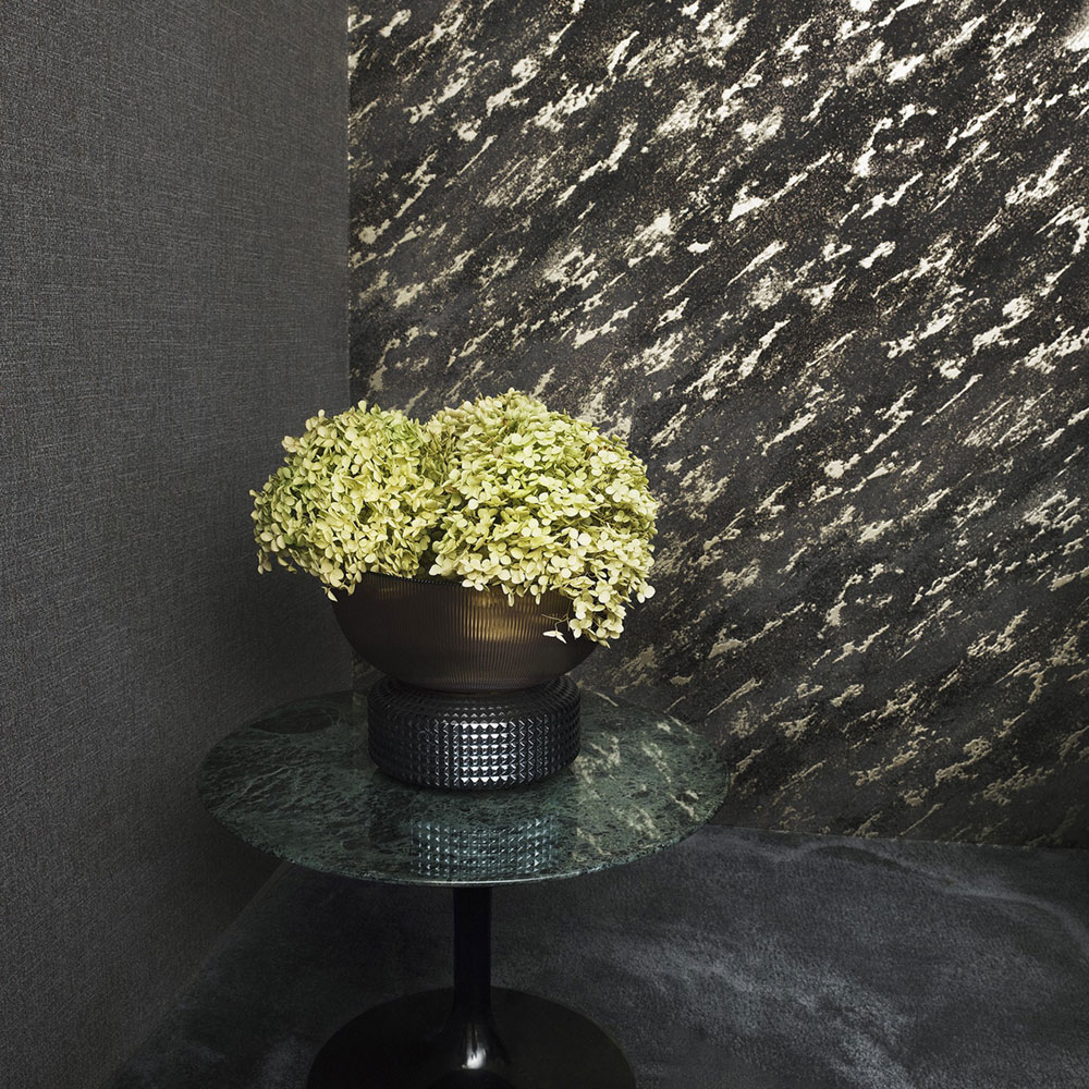 Vliesová tapeta s vinylovým povrchem, látková textura, šedo-černá melanž se zlatými a bronzovými akcenty.