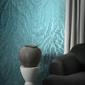 Vliesová tapeta s vinylovým povrchem, proužková textura s efektem moaré, ostíny modré/tyrkysové.