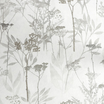 Vliesová tapeta s vinylovým povrchem, bílý štukový podklad, motivy lučních trav a listů v odstínech šedé, místy kovově stříbrné.
