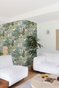 Vliesová tapeta s vinylovým povrchem, krémový podklad, motiv stromů v odstínech zelené a hnědé, jemná textura.