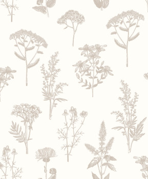 Vliesová tapeta s vinylovým povrchem, podklad bílý / slonová kost, vzor metalický kovově stříbrný - luční květiny a trávy.