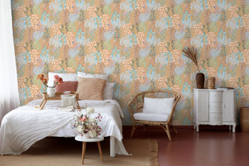 Vliesová tapeta s vinylovým povrchem, hnědo-oranžový podklad, motivy květin a listů, zlaté detaily, jemná textura.