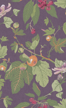 Vliesová tapeta na zed, švestkově fialový podklad imitující látkovou texturu, motivy listů a plodů.