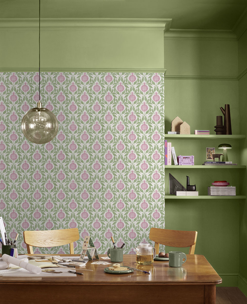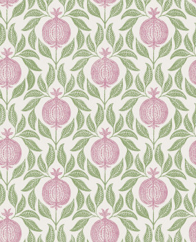 Vliesová tapeta na zed, světle béžový podklad, motivy zelených listů a růžových granátových jablek.