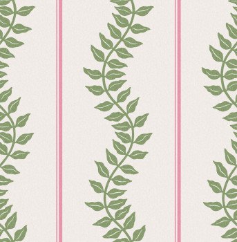 Vliesová tapeta na zed, světle béžový podklad, růžové proužky, zelené vavřínové listy.