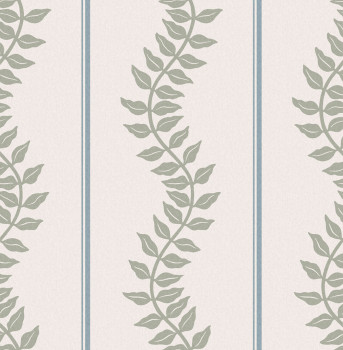 Vliesová tapeta na zed, světle béžový podklad, modré proužky, šalvějově zelené vavřínové listy.