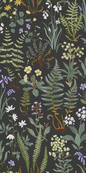 Vliesová tapeta na zed, černý podklad, vzor jarních květin a kapradin.