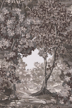 Vliesová tapeta na zed, motiv stromů v odstínech hnědo-šedé, efekt látkové textury.