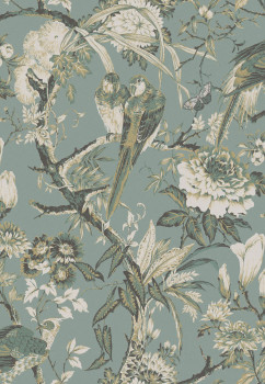 Vliesová tapeta na zed, motiv exotických ptáků mezi květinami a větvičkami stromů, pololesklý tyrkysový podklad, zlato-béžový a tyrkysový vzor, vláknitá textura.