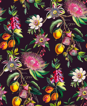 Vliesová tapeta na zed, černý podklad, motiv větviček rozkvetlé Mučenky.