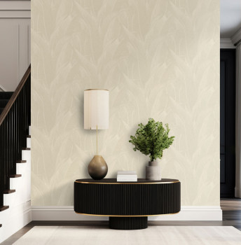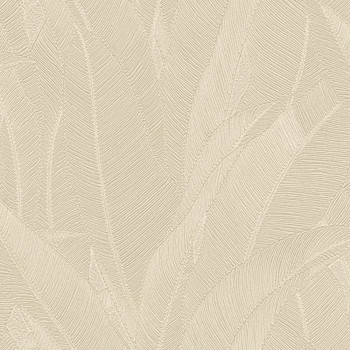 Luxusní vliesová tapeta s vinylovým povrchem, pololesklý béžový podklad, plastické šedo-stříbrné linie tvoří stylizované listy.
