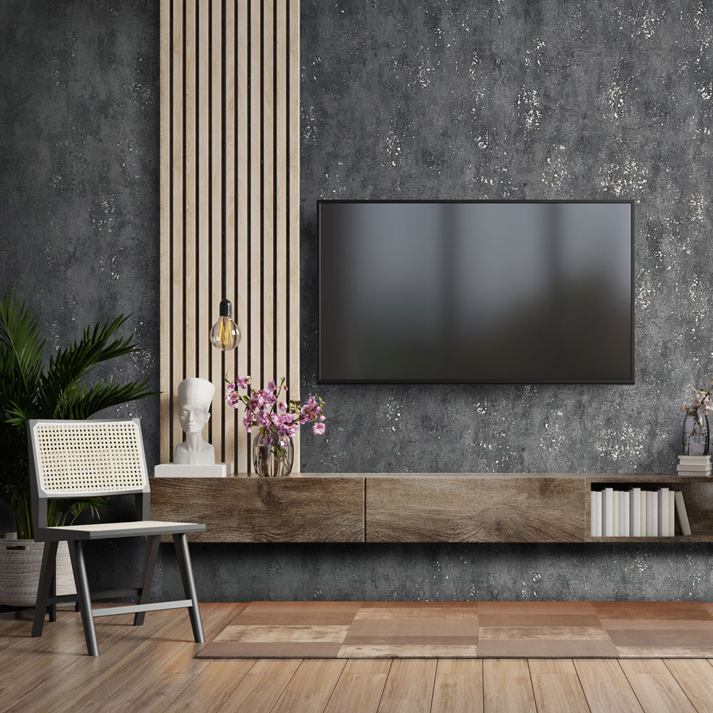 Vliesová tapeta s vinylovým povrchem, dekor černé štukové omítky s šedo-stříbrnými detaily, jemná textura.