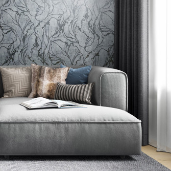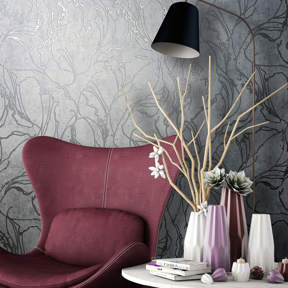 Šedá vliesová tapeta s vinylovým povrchem, prolisovaný metalický stříbrný abstraktní vzor.