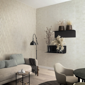 Vliesová tapeta s vinylovým povrchem, šedo-béžová, prolisovaný metalický zlatý vlnkový vzor.