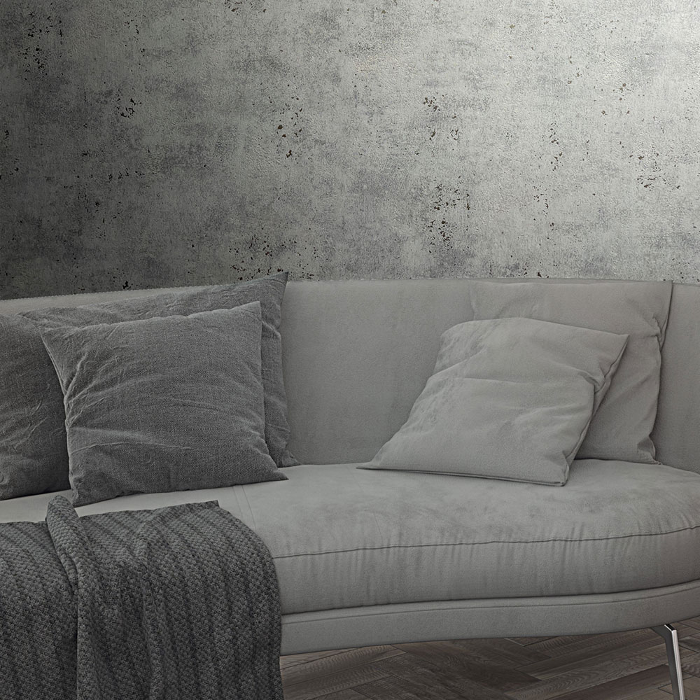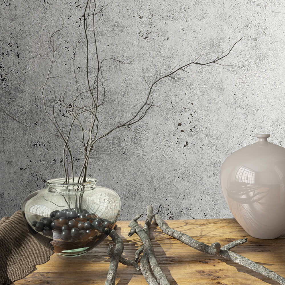 Šedo-stříbrná vliesová tapeta s vinylovým povrchem, dekor štukové omítky, mat a jemný pololesk, jemná textura.