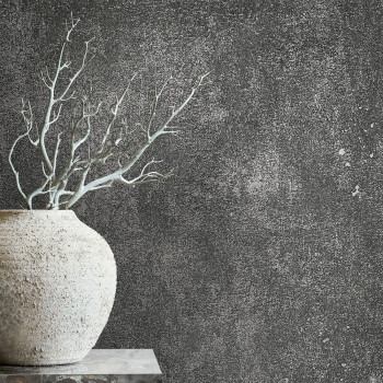 Černo-stříbrná vliesová tapeta s vinylovým povrchem, dekor štukové omítky, mat a jemný pololesk, jemná textura.
