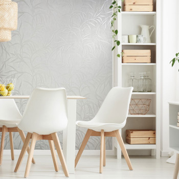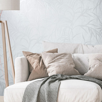 Vliesová tapeta s vinylovým povrchem, dekor bílo-krémové štukové omítky, prolisované pololesklé listy.