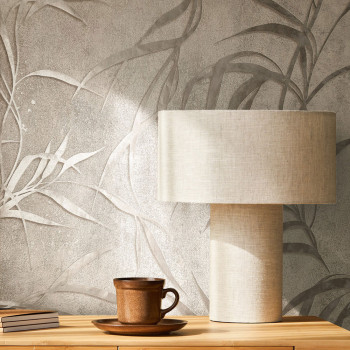 Vliesová tapeta s vinylovým povrchem, dekor pololesklé šedo-béžové štukové omítky, prolisované lesklé kovově zlaté listy.