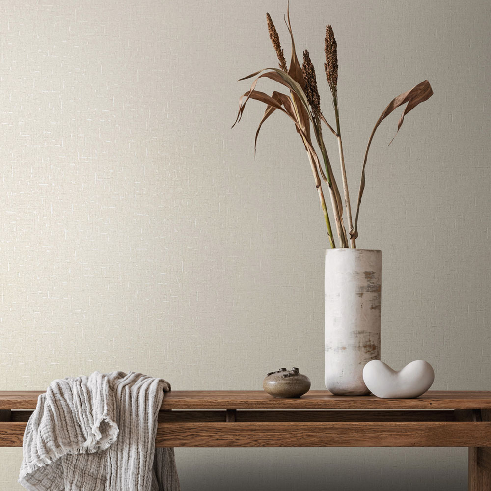 Vliesová tapeta s vinylovým povrchem, látková textura v béžových odstínech, místy metalické plošky.