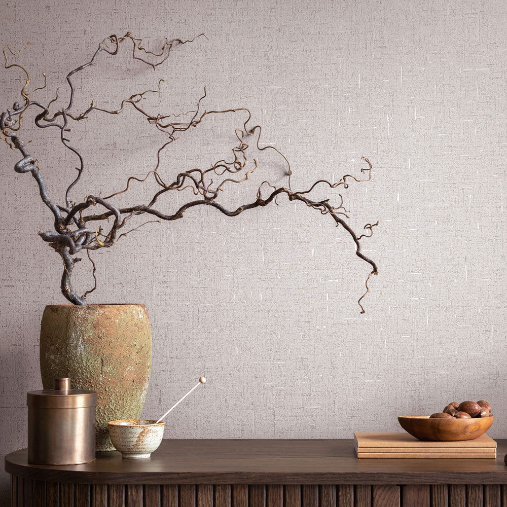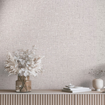 Vliesová tapeta s vinylovým povrchem, látková textura v béžových odstínech, místy lesklé detaily a metalické plošky.