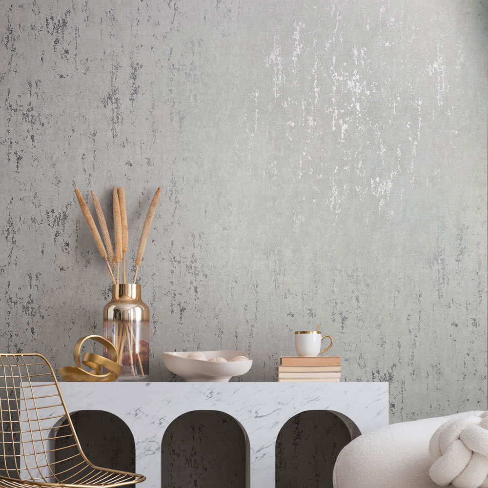 Vliesová tapeta s vinylovým povrchem, dekor šedé štukové omítky, místy stříbrné metalické plochy, jemná textura.