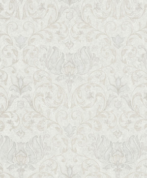 Vliesová tapeta s vinylovým povrchem, zámecký ornamentální vzor ve vintage stylu, odstíny šedo-béžové, jemná textura.
