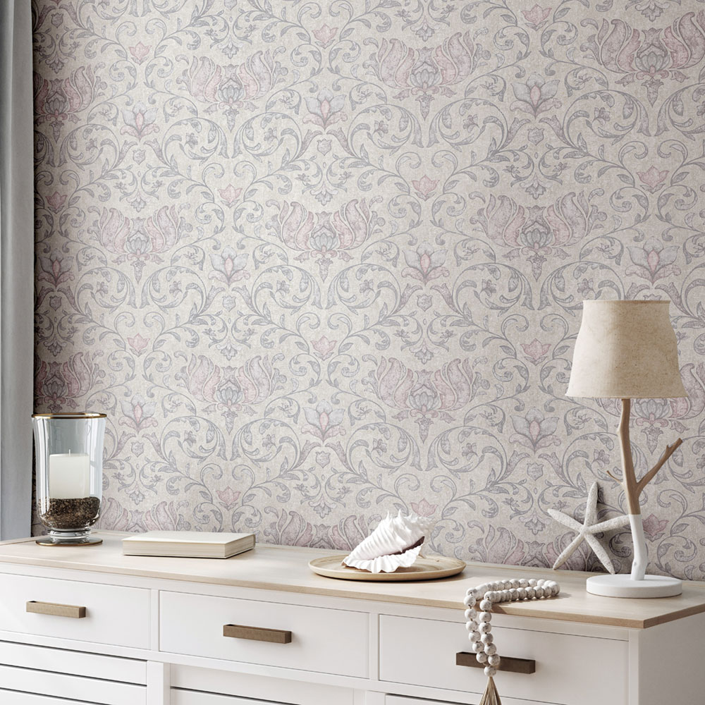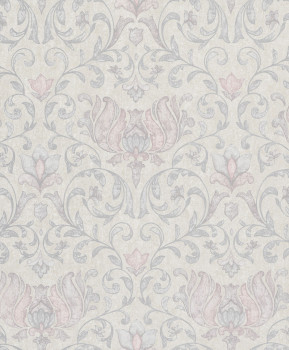 Vliesová tapeta s vinylovým povrchem, zámecký ornamentální vzor ve vintage stylu, odstíny béžové, šedé a růžové, jemná textura.