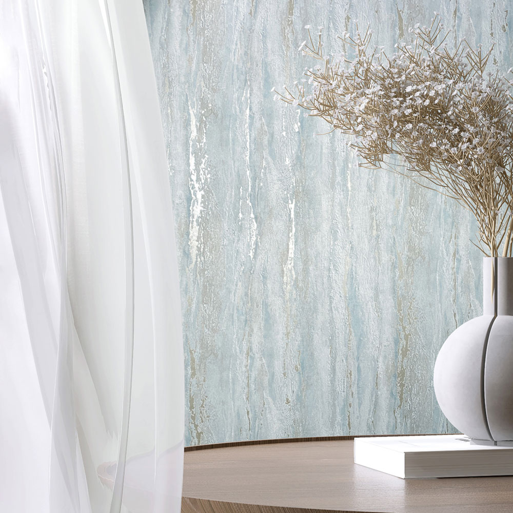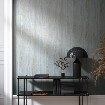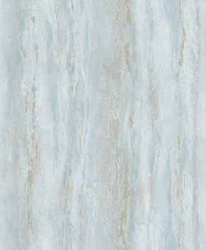 Vliesová tapeta s vinylovým povrchem, dekor tyrkysové štukové omítky, metalické zlaté prolisy, jemná textura.