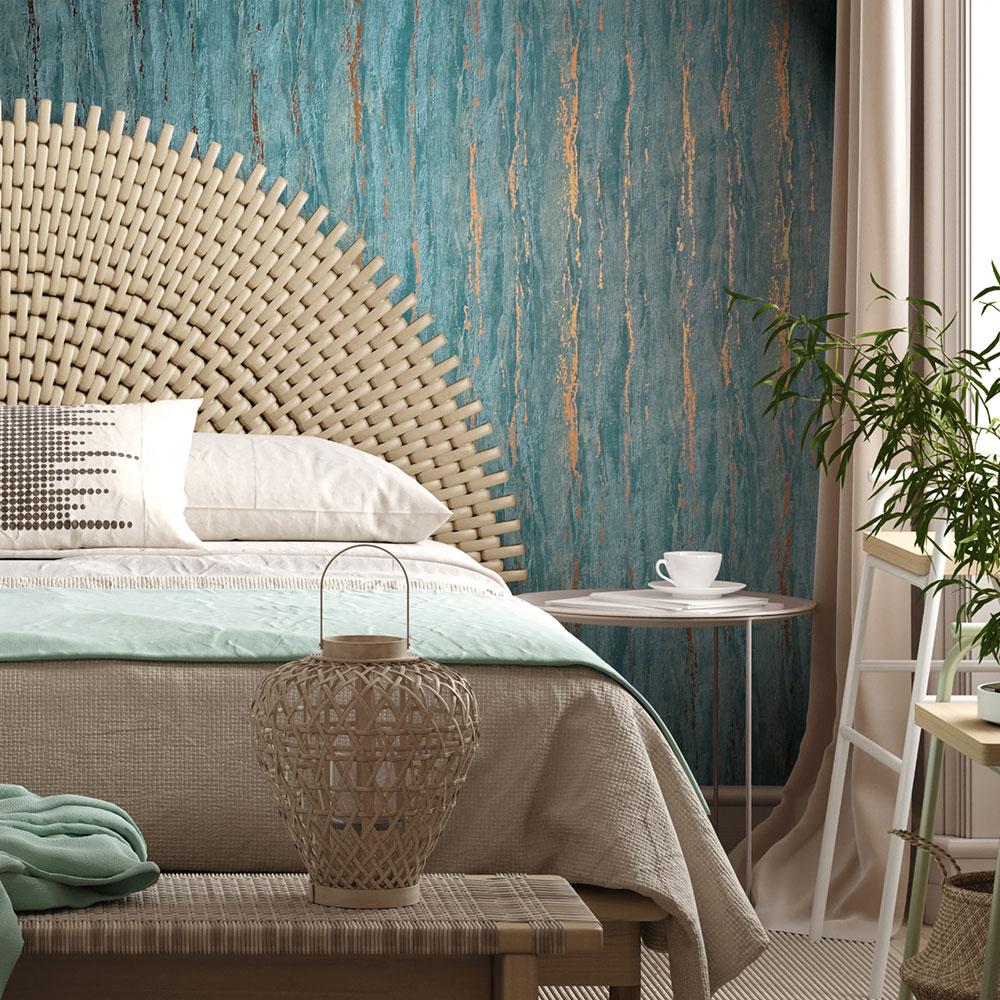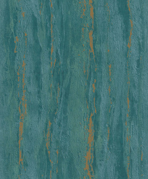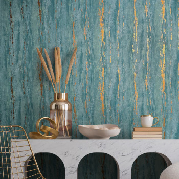 Vliesová tapeta s vinylovým povrchem, dekor tyrkysové štukové omítky, metalické zlaté prolisy, jemná textura.