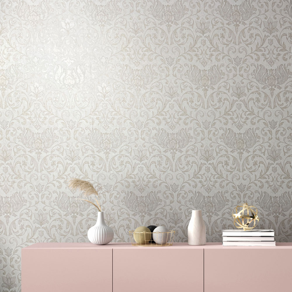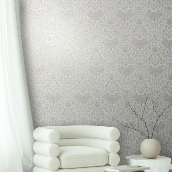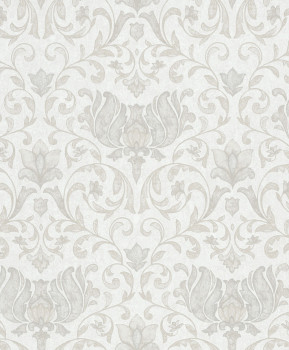 Vliesová tapeta s vinylovým povrchem, zámecký ornamentální vzor ve vintage stylu, odstíny krémové a béžové, jemná textura.