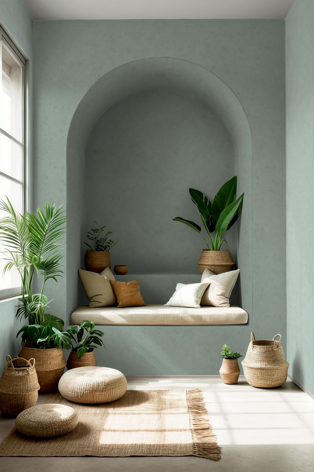 Vliesová tapeta na zeď, odstíny zelené, vzhled štukové omítky.